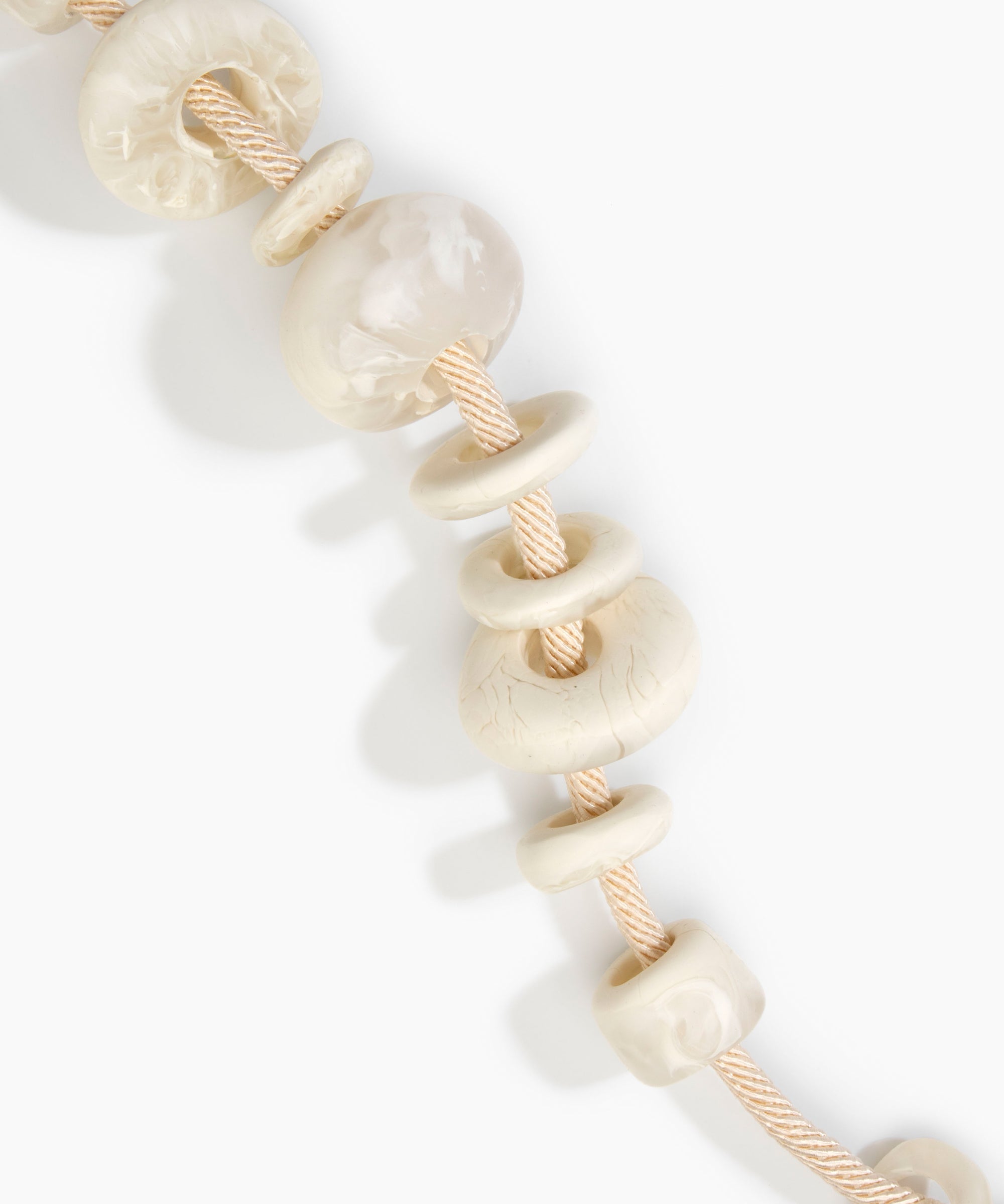 Resin beads thread on cord with a brass T-bar fastening