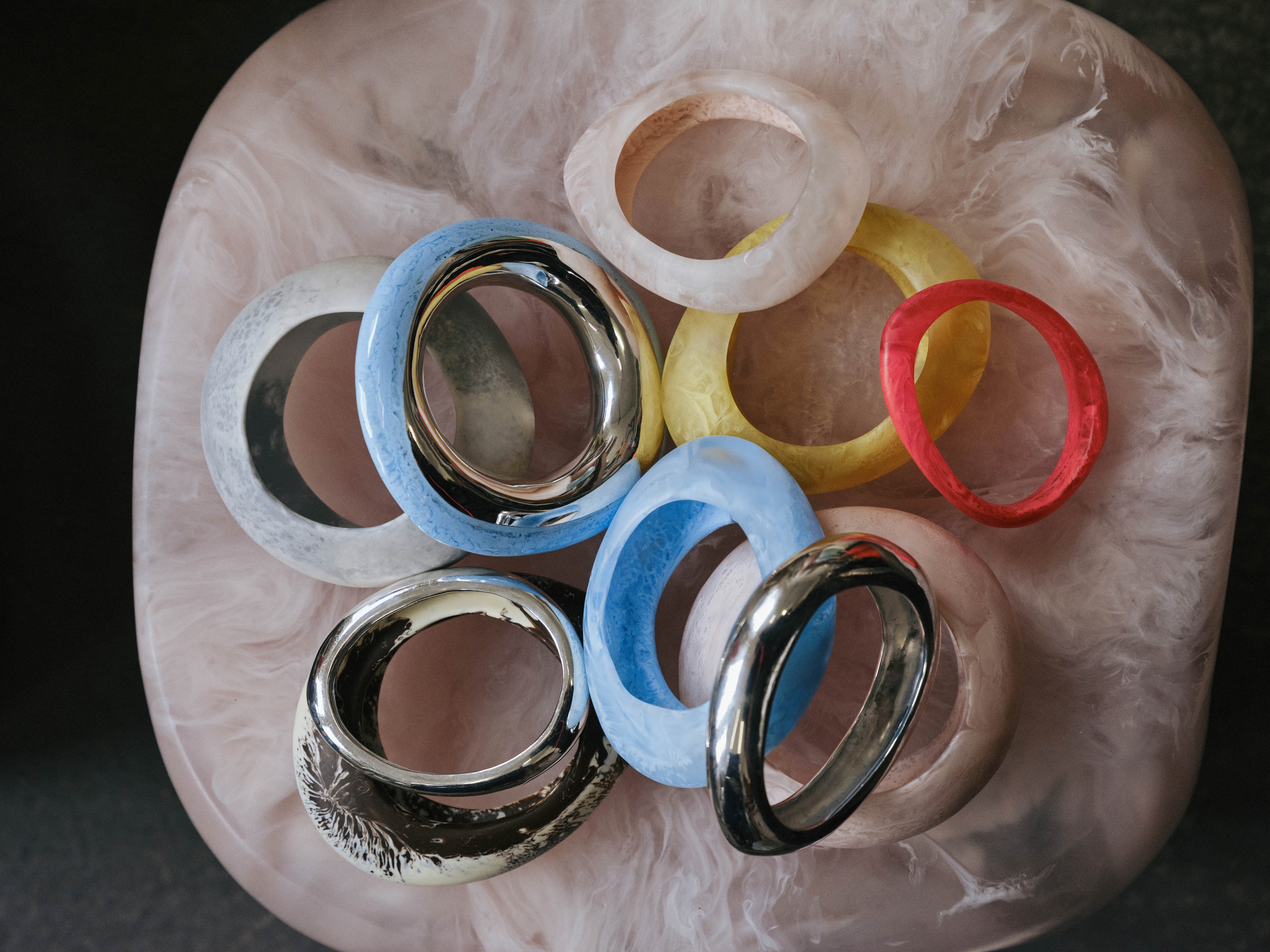 A cornerstone of the Dinosaur Design offering, our handmade resin bangles and bracelets are crafted in organic forms in narrow to daring proportions, each exuding modernity and individuality.