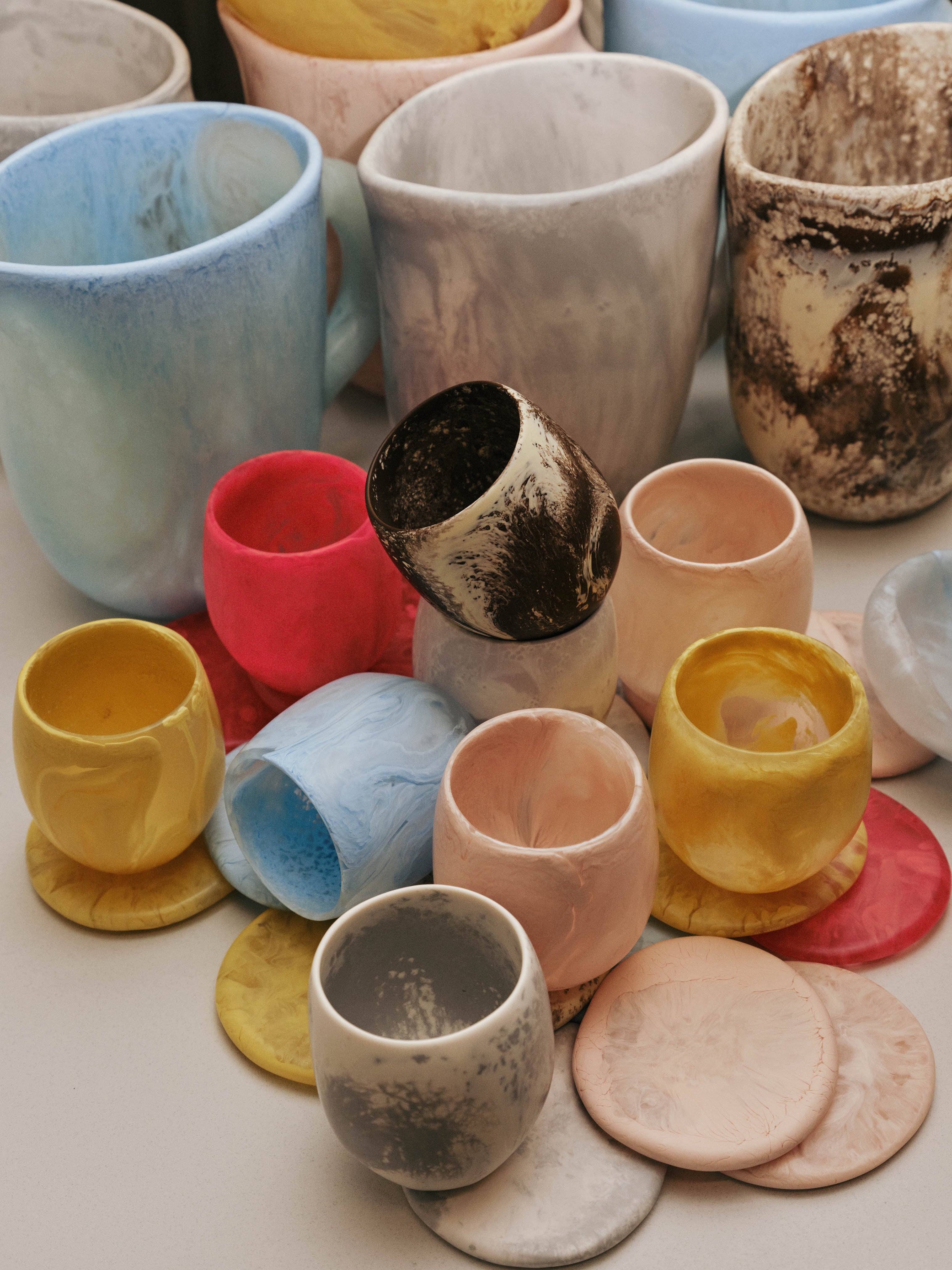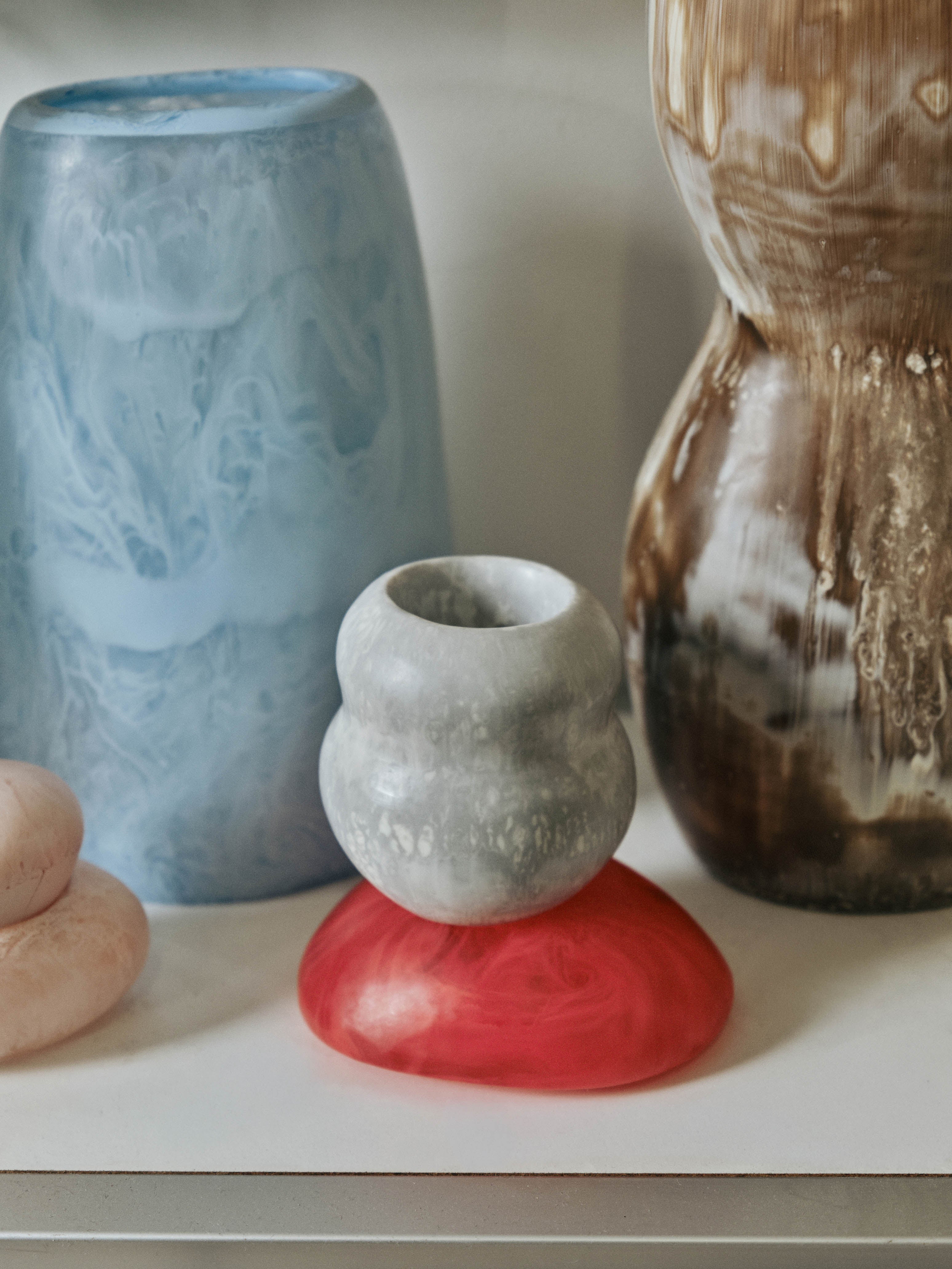 A collection of stone-like, lithic silhouettes are cast resin, in Cappuccino, Pollen, Rose Swirl and two new colourways, Cloud and Pool. Vases hero of the collection’s homewares, with several new vessels in low and hourglass shapes. Accompanying these are new forms of the Bones design family, adding new bowls, dishes and plates. Each of continuing their distinctive curvature.