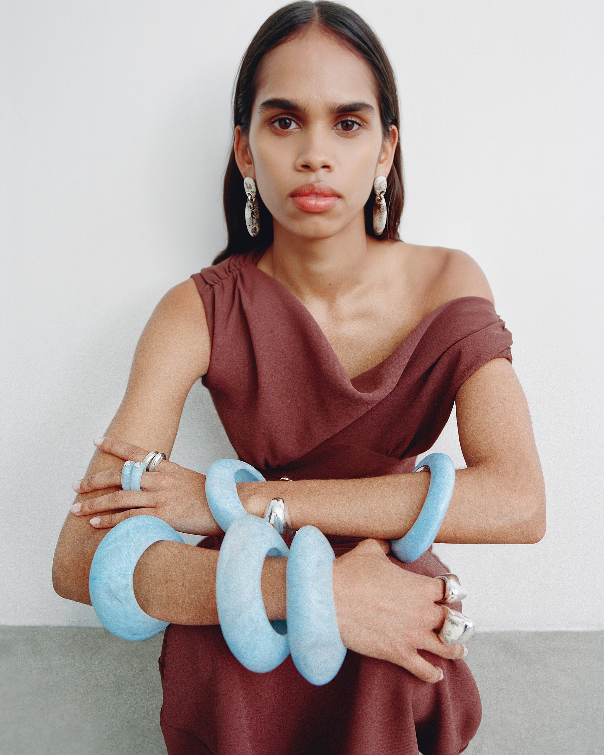 Referencing organic rock formations, the Long Rock Duo Earrings connect two smooth resin beads, refined to a polished finish. At their linking point, each bead is accented with silver within its internal void, creating a dual finish. As a drop‑earring style, the interlinked beads enable a sense of movement for the wearer.