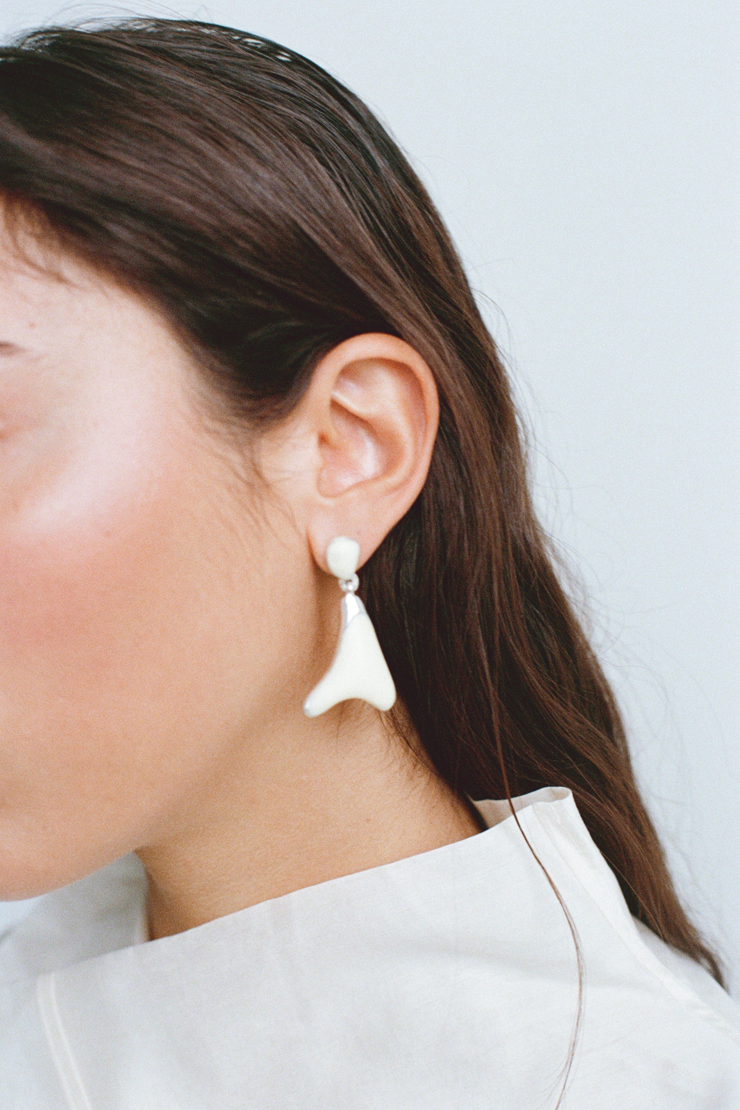 Referencing anatomical forms, the Medium Wishbone Earrings feature two linked silver-fused resin beads, allowing for movement when worn. The resin beads are framed with silver detailing, drawing focus to the resin's distinctive, marbled surface.