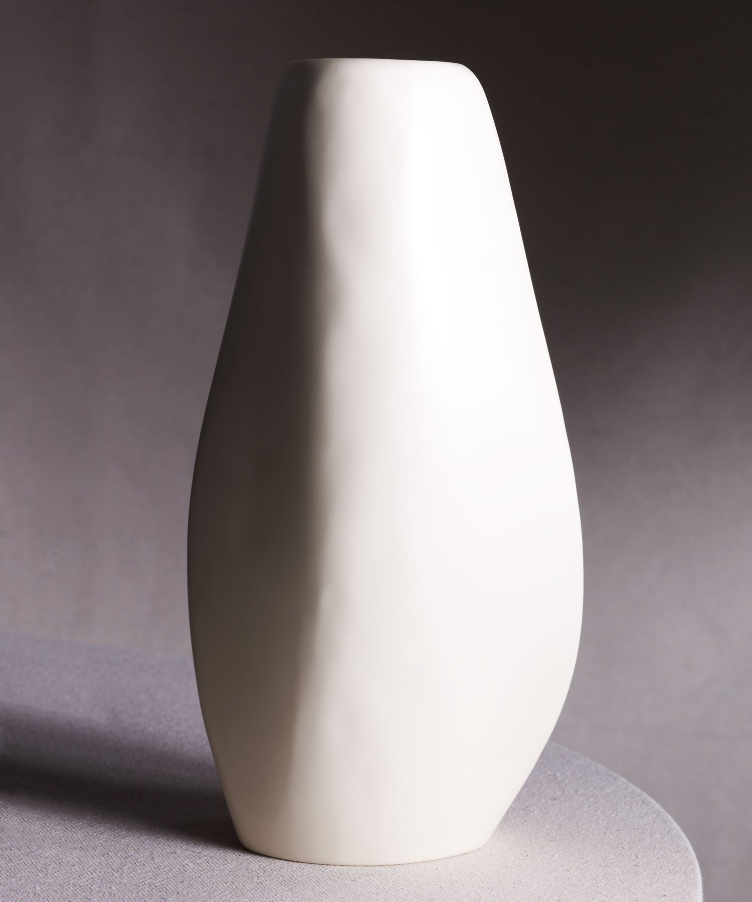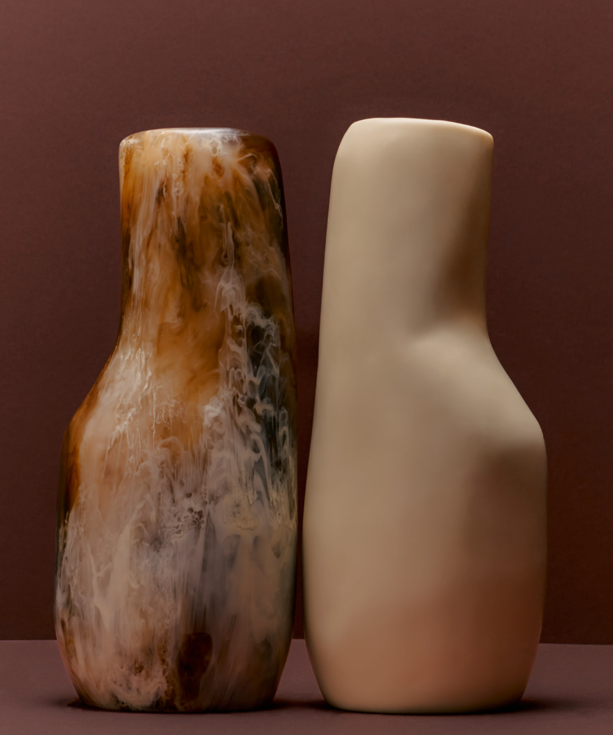 Abstract resin vases in cream and grey colourways, on a neutral background