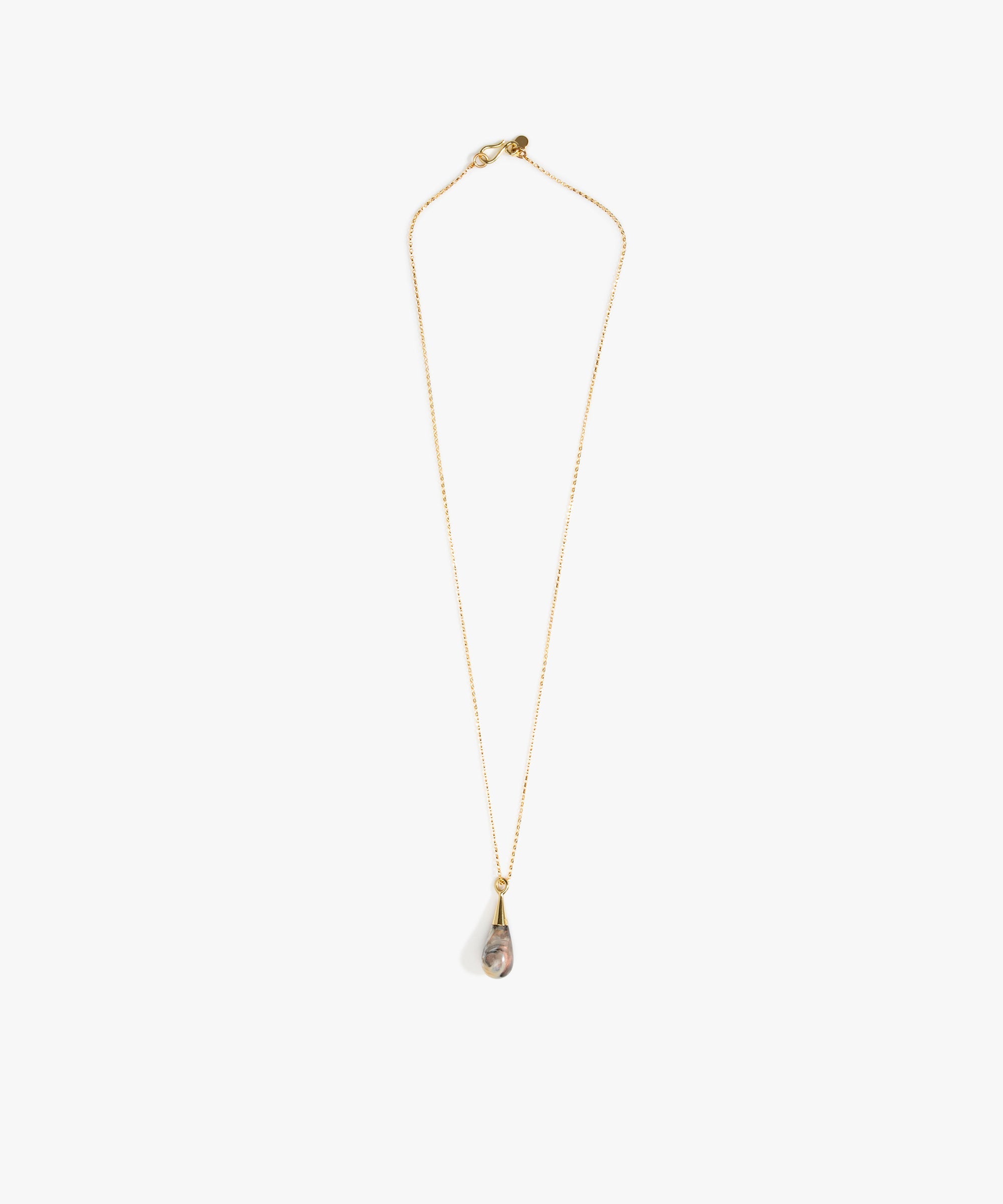 Inspired by a glistening water droplet, our Small Brass Dew Drop Pendant showcases vibrant resin swirls fused with nano-coated brass. The brass detail elegantly threads through a 14k gold-filled chain, culminating with a brass DD logo tag at its tail end.