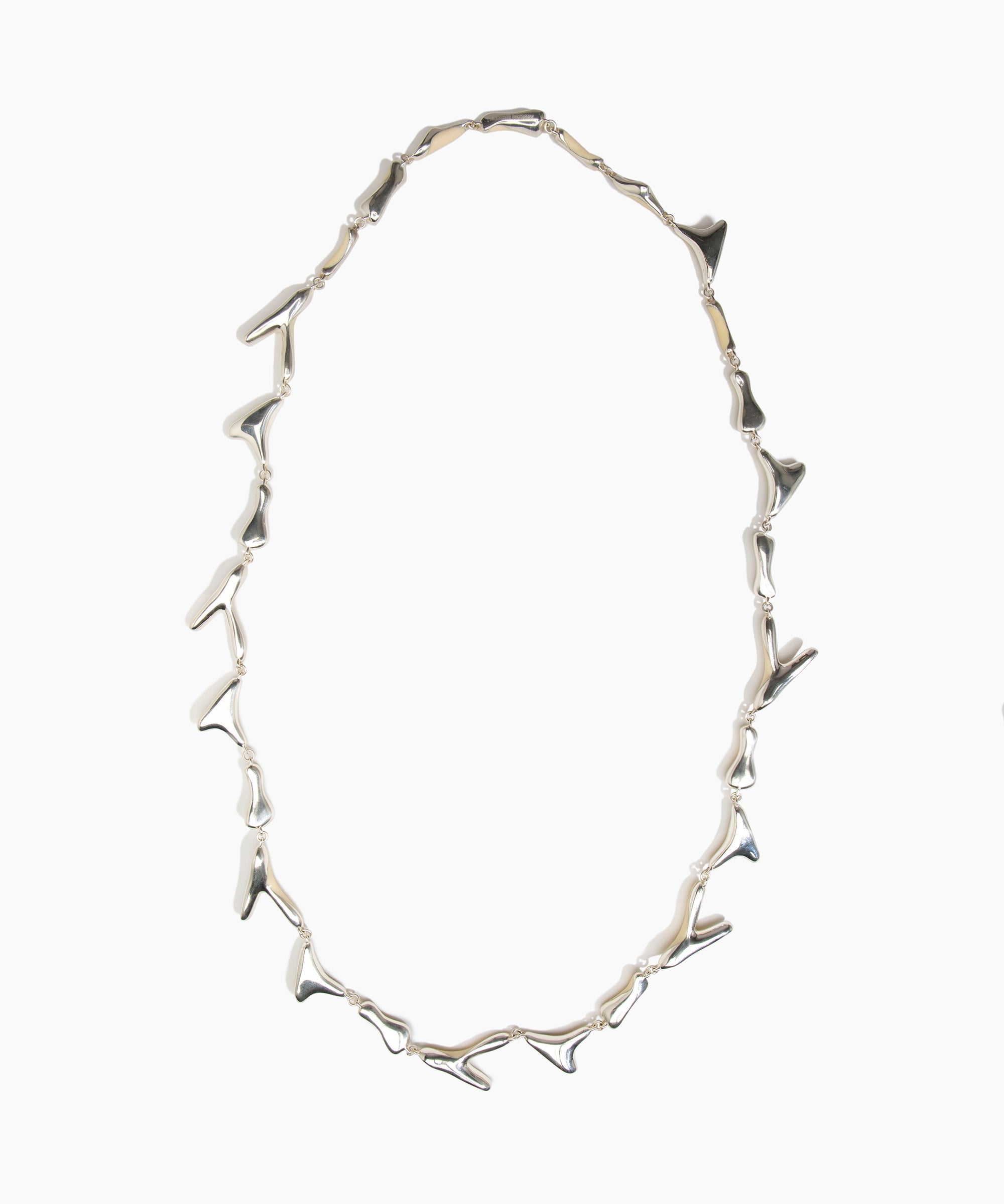Referencing anatomical forms, the Long Bones Necklace intricately links varied organic silver-fused resin beads, creating a detailed, long-line necklace. Each resin bead is framed with silver detailing, drawing focus to the resin's distinctive, marbled surface.